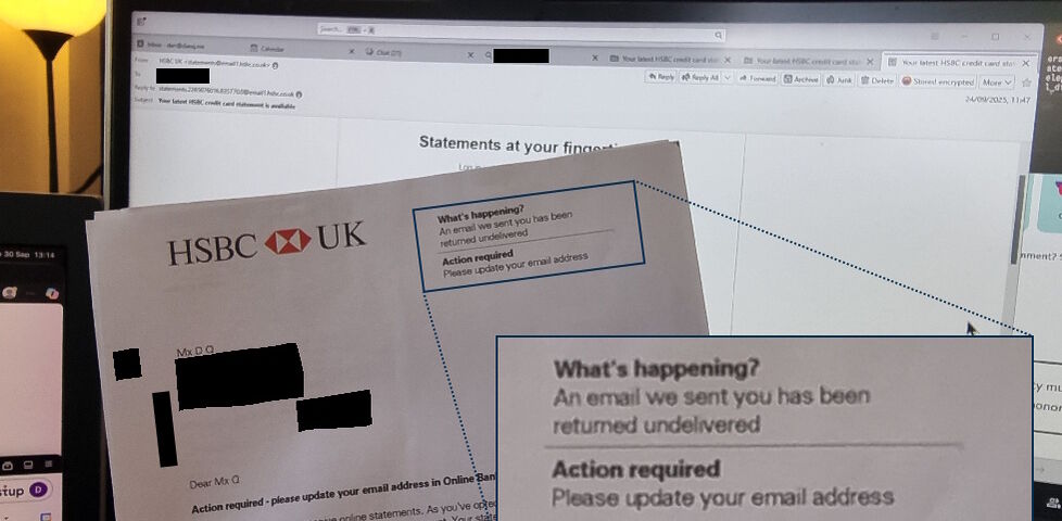 A confusing letter from HSBC informed me that I've not been receiving their emails, and I have to change the email address they use to contact me. Except I've been receiving all of their emails just fine! The problem, it turns out, is that surveillance capitalism is now so-widespread that the bank cannot conceive that their own attempts to spy on their customers might not be 100% reliable... Read more →