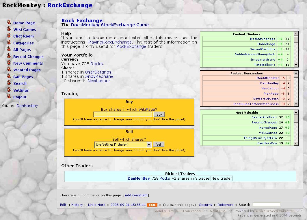 In Rock Exchange, players will be able to invest their hard-earned Rocks (a unit of currency) in shares in the various pages on the RockMonkey wiki. The value of these shares will fluctuate based on several characteristics, and players will have to play the odds in order to know when to buy and when to sell to gain a return on their investment. A page’s shares fluctuate based on:
