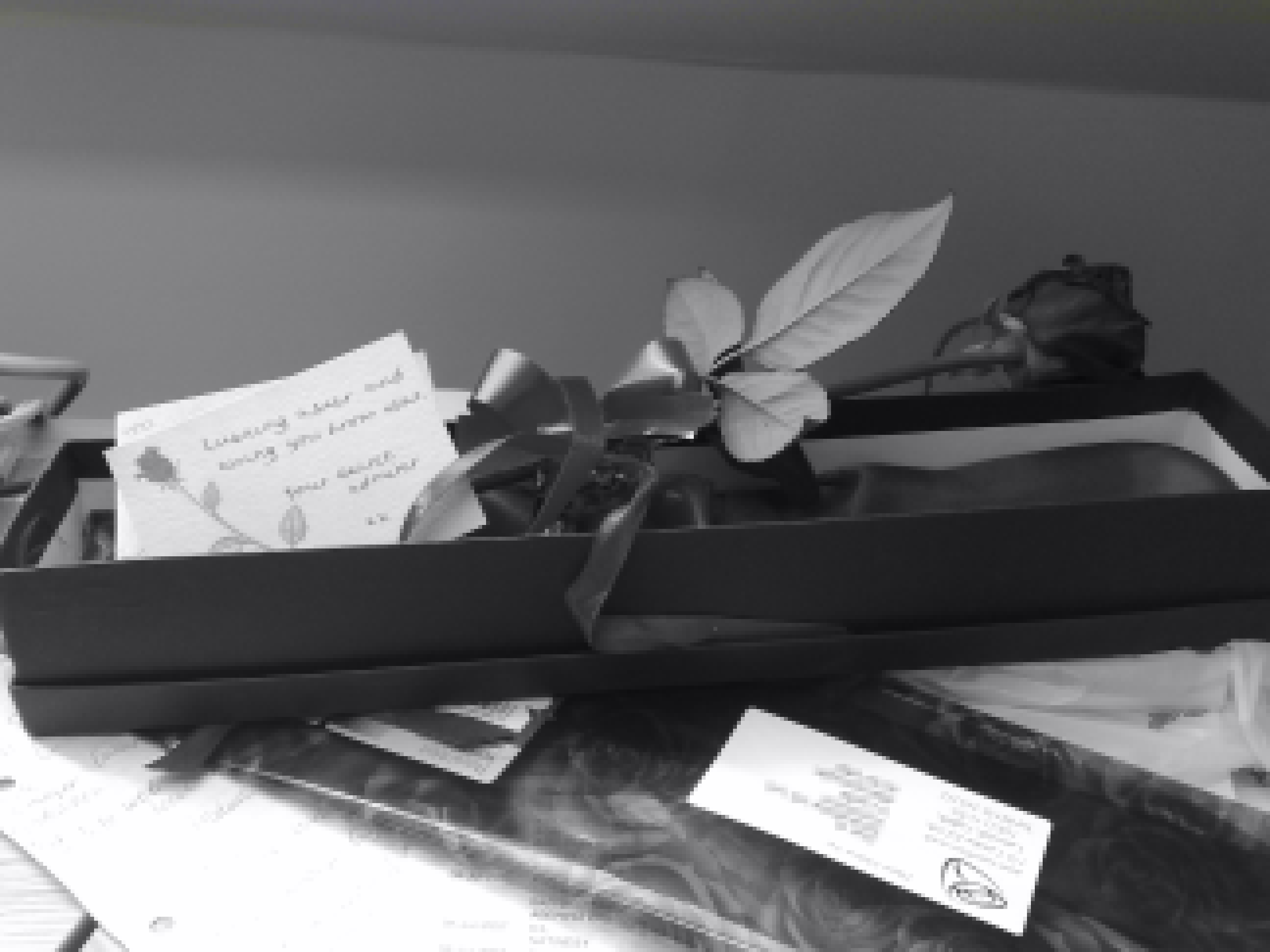 I opened it up, watched by my co-workers. The box contained a single rose, it’s petals dyed purple, wrapped in a red ribbon, and a tiny envelope with my name hand-written on it. Looking in the envelope, I found a small card with the following message: