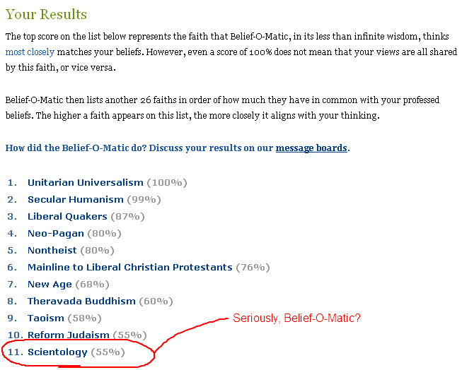 Apparently I could be a scientologist, so says the Belief-O-Matic. Okay, it’s not at the top of the list, but it’s still almost within the “top 10” guesses.
