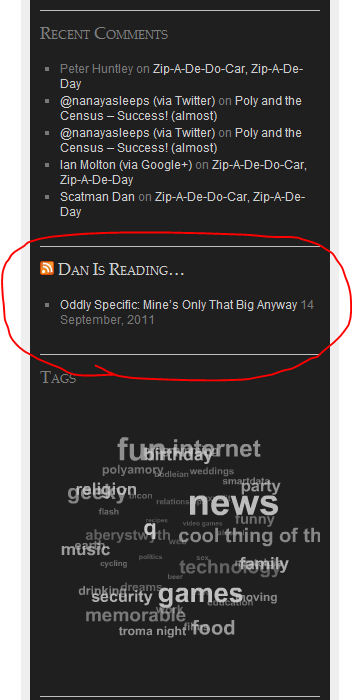 I’ve had just one problem: it’s not quite so tolerant of badly-formed XML as Google Reader. There’s one feed in my list which, it turns out, has (very) invalid XML in it’s feed, that Google Reader managed to ignore and breeze over, but Tiny Tiny RSS chokes on. I’ve contacted the site owner to try to get it fixed, but if they don’t, I might have to hack some code to try to make a workaround. Not ideal, and not something that everybody would necessarily want to deal with, so be aware!