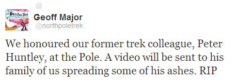 So it was a really special moment to discover that, this weekend, my dad finally made it to the pole. My sisters and I had arranged that a portion of his cremated ashes would be carried with the polar trek team and scattered at what must be one of the most remote places on Earth – the very top of the world. It’s nice to think that not even death was enough to stop my dad from getting to the planet’s most Northernmost spot, even if he had to be carried for the last 600 miles.