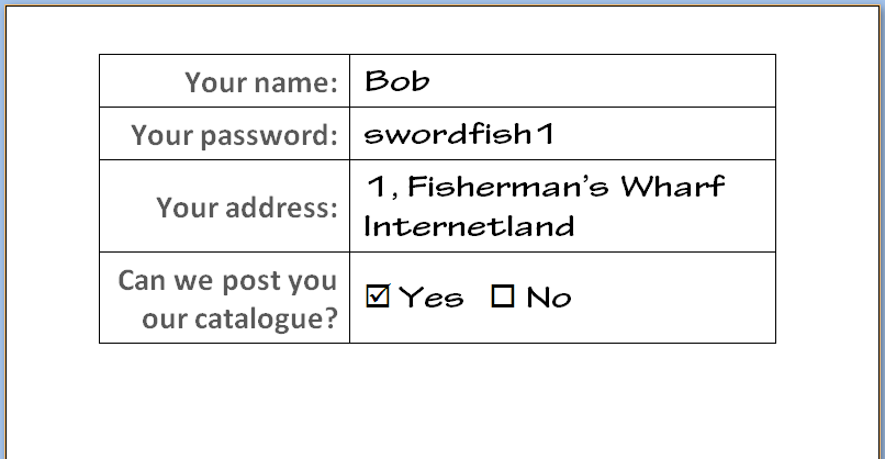Alice checked the form and, sure, that was the password that Bob chose when he registered, so now she knew that it really was him. When he asked for a set of chairs he’d found to be delivered, Alice was able to simply ask, “You want that delivered to 1 Fisherman’s Wharf, right?”, and Bob just nodded. Simple!