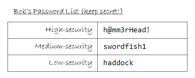 Bob thinks he’s cleverer than most people, though. Rather than use the same password everywhere he goes, he has three different passwords. The first one is his “really secure” one: it’s a good password, and he’s proud of it. He only uses it when he talks to his bank, the tax man, and his credit card company – the stuff he thinks is really important. Then he’s got a second password that he uses when he goes shopping, and for the clubs he joins. A third password, which he’s been using for years, he reserves for places that demand that he chooses a password, but where he doesn’t expect to go back to: sometimes he joins in with Internetland debates and uses this password to identify himself.