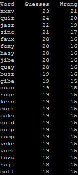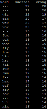 Running the program, we can see that the hardest three-letter word is “xxv”, which would take 22 guesses (20 of them wrong!) to get. But aside from the roman numeral for 25, I don’t think that “xxv” is actually a word. Perhaps my dictionary’s not very good. “Oak”, though, is definitely a word, and at 20 guesses (17 wrong), it’s easily enough to hang your opponent no matter how many strokes it takes to complete the gallows.