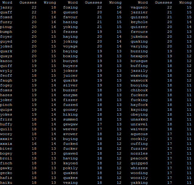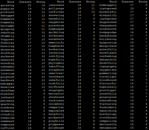 In case you’re interested, then, here are the theoretically-hardest words to throw at your hangman opponent. While many of the words there feel like they would quite-rightly be difficult, others feel like they’d be easier than their ranking would imply: this is probably because they contain unusual numbers of vowels or vowels in unusual-but-telling positions, which humans (with their habit, inefficient under normal circumstances, of guessing an extended series of vowels to begin with) might be faster to guess than a computer.