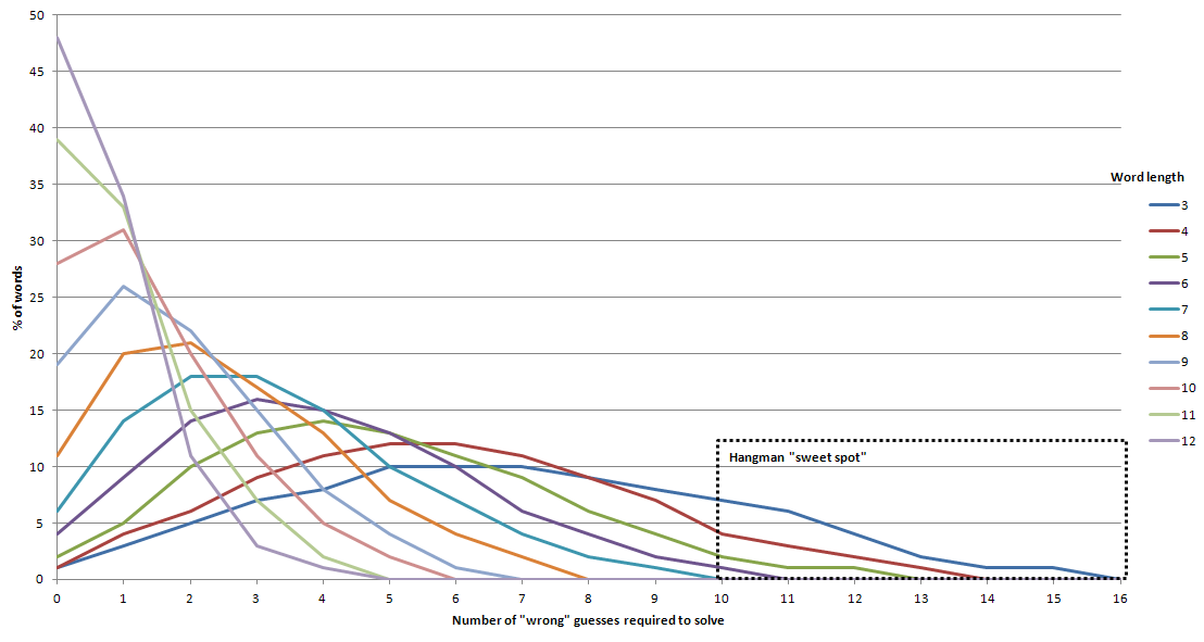 When we make a graph of each word length, showing which proportion of the words require a given number of “wrong” guesses (by an optimised player), we discover a “sweet spot” window in which we’ll find all of the words that an optimised player will always fail to guess (assuming that we permit up to 10 incorrect guesses before they’re disqualified). The window seems small for the number of times I remember seeing people actually lose at hangman, which implies to me that human players consistently play sub-optimally, and do not adequately counteract that failing by applying an equal level of “smart”, intuitive play (knowing one’s opponent and their vocabulary, looking for hints in the way the game is presented, etc.).