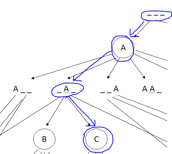 First, though, we need to understand how hangman is perfectly played. Based on the assumption that the “executioner” player is choosing words randomly, and that no clue is given as to the nature of the word, we can determine the best possible move for all possible states of the game by using a data structure known as a tree. Suppose our opponent has chosen a three-letter word, and has drawn three dashes to indicate this. We know from Nick’s article that the best letter to guess is A. And then, if our guess is wrong, the next best letter to guess is E. But what if our first guess is right? Well, then we’ve got an “A” in one or more positions on the board, and we need to work out the next best move: it’s unlikely to be “E” – very few three-letter words have both an “A” and an “E” – and of course what letter we should guess next depends entirely on what positions the letters are in.