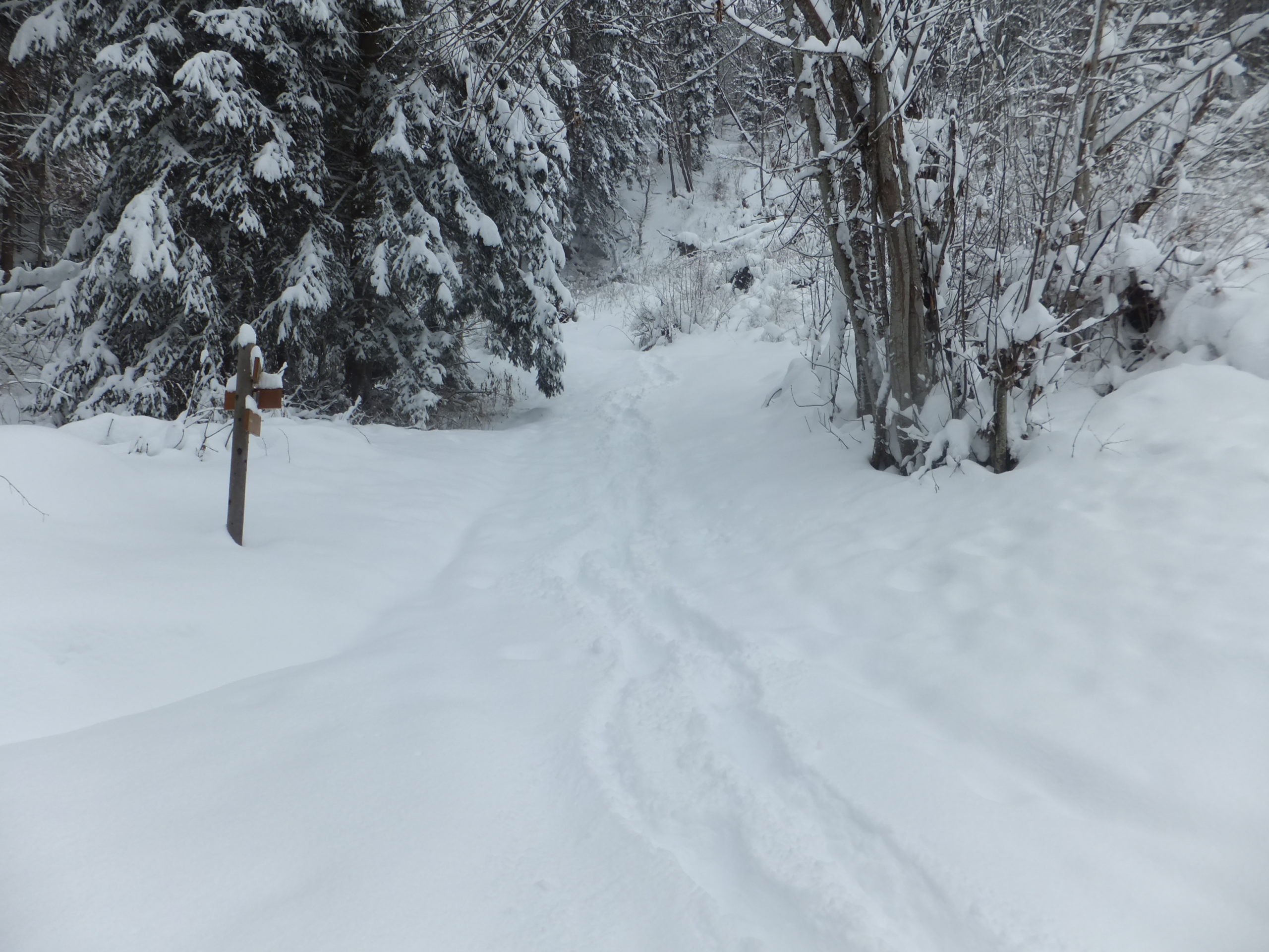 After La Nouvaz, the path became even harder to navigate, and in the thinner tree cover huge drifts formed where underneath there were presumably walls and fences. At one point, I
