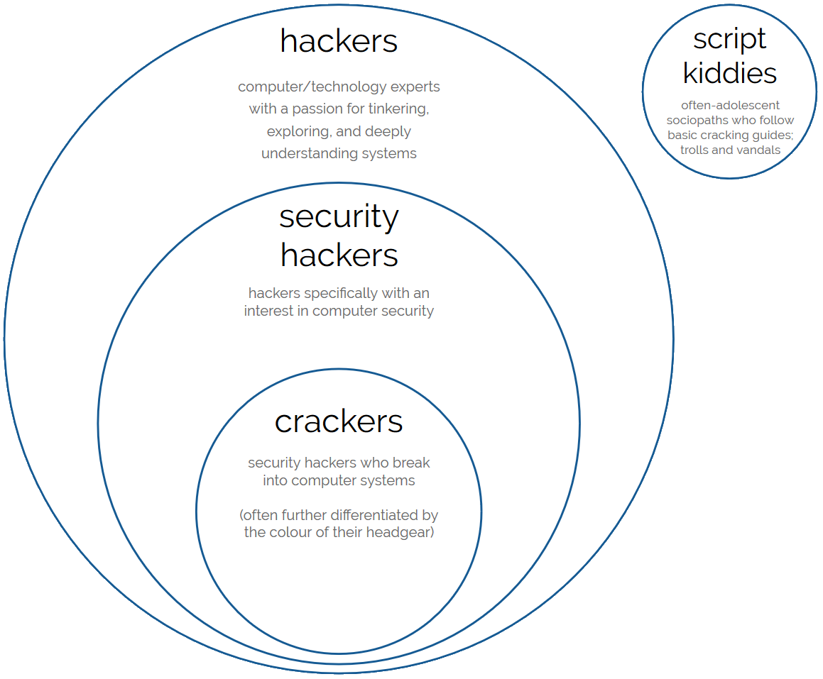 What the media generally refers to as “hackers” would be more-accurately, within the hacker community, be called crackers; a subset of security hackers, in turn a subset of