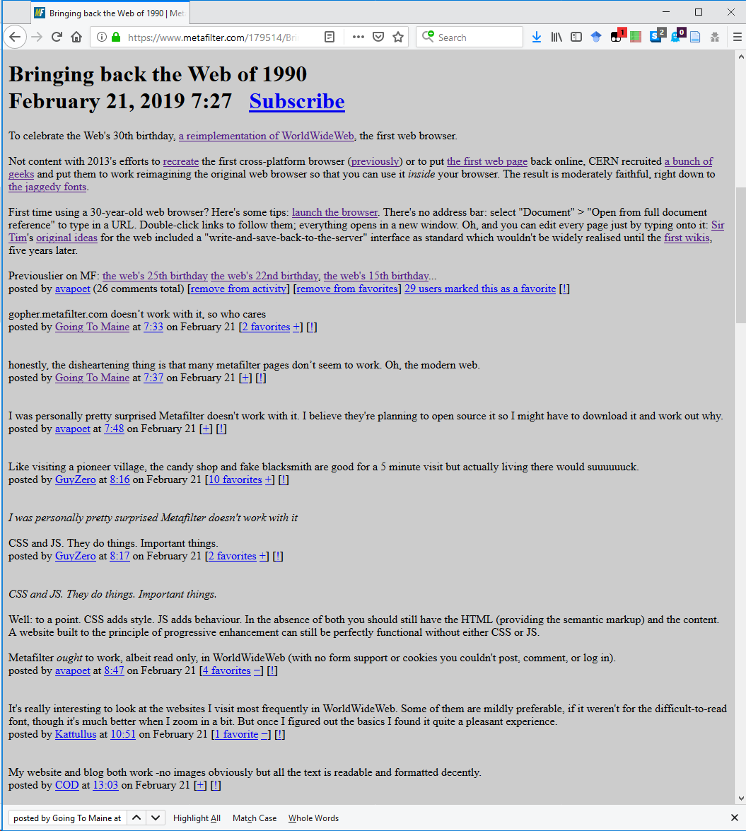 Earlier this week, I mentioned the exciting hackathon that produced a moderately-faithful reimagining of the world’s first Web browser. I was sufficiently excited about it that I not only blogged here but I also posted about it to MetaFilter. Of course, the very first thing that everybody there did was try to load MetaFilter in it, which… didn’t work.