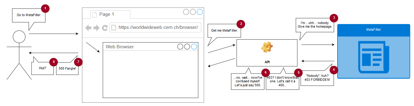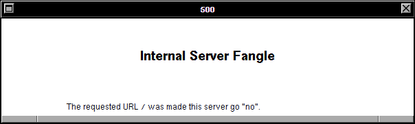 - The API is programmed to handle response codes 200 (okay!) and 404 (not found), but if it gets anything else back it’s supposed to throw a 400 (bad request). Except there’s a bug: when trying to throw a 400, it requires that an error message has been set by the request module and if there hasn’t… it instead throws a 500 with the message “Internal Server Fangle” and no clue what actually went wrong. So MetaFilter’s 403 gets translated by the proxy into a 400 which it fails to render because a 403 doesn’t actually produce an error message and so it gets translated again into the 500 that you eventually see. What a knock-on effect!
