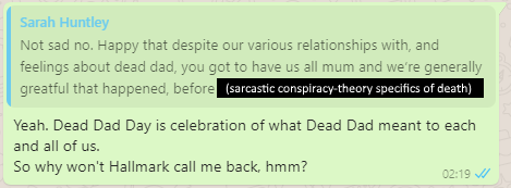 We all get to live, and we’re all going to die, and I’d honestly be delighted if I thought that people might remember me with the same kind of smile (and just occasionally tear) that finds my face every Dead Dad Day.