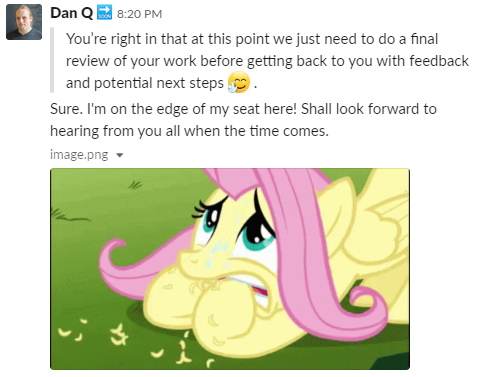My initial interview took place 20 days after my application: entirely over text-based chat on Slack, of course.