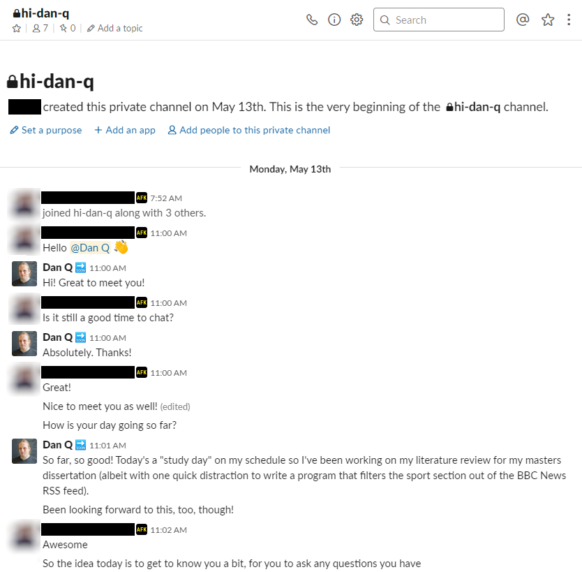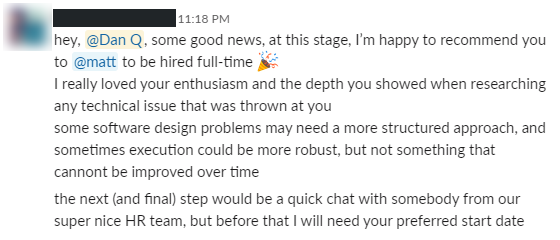 I received an automated reply less that a minute later, and an invitation to a Slack-based initial interview about a day and a half after that. That felt like an incredibly-fast turnaround, and I was quite impressed with the responsiveness of what must necessarily be a reasonably-complex filtering and process-management process… or perhaps my idea of what counts as “fast” in HR has been warped by years in a relatively slow-moving and bureaucratic academic environment!
