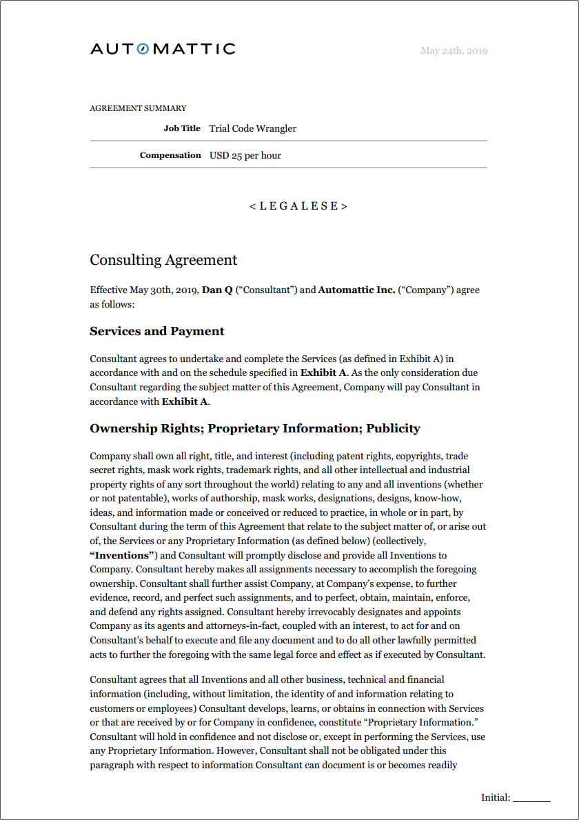 Of all the things that make Automattic’s hiring process especially unusual and interesting, even among hip Silicon Valley(-ish, can a 100% “distributed” company really be described in terms of its location?) startups, probably the most (in)famous is the trial contract. Starting from day -147, near the end of May, I was hired by Automattic as a contractor, given a project and a 40-hour deadline, at $25 USD per hour within which to (effectively) prove myself.
