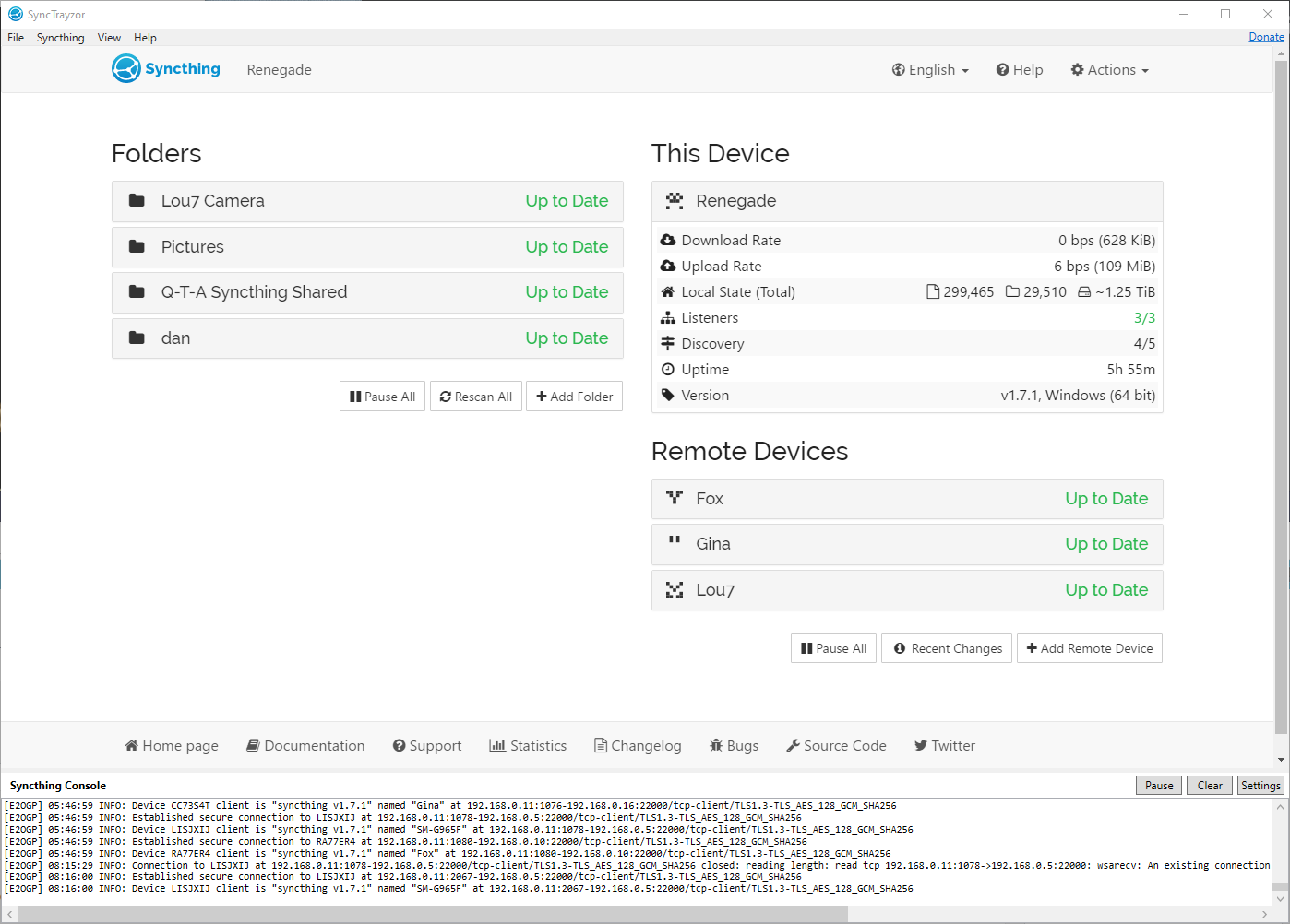 Plus: because Syncthing can share a folder between any number of devices, the same sharing mechanism that puts my phone’s photos onto my main desktop can simultaneously be pushing them to the NAS, providing redundant connections. And it was a doddle to set up.