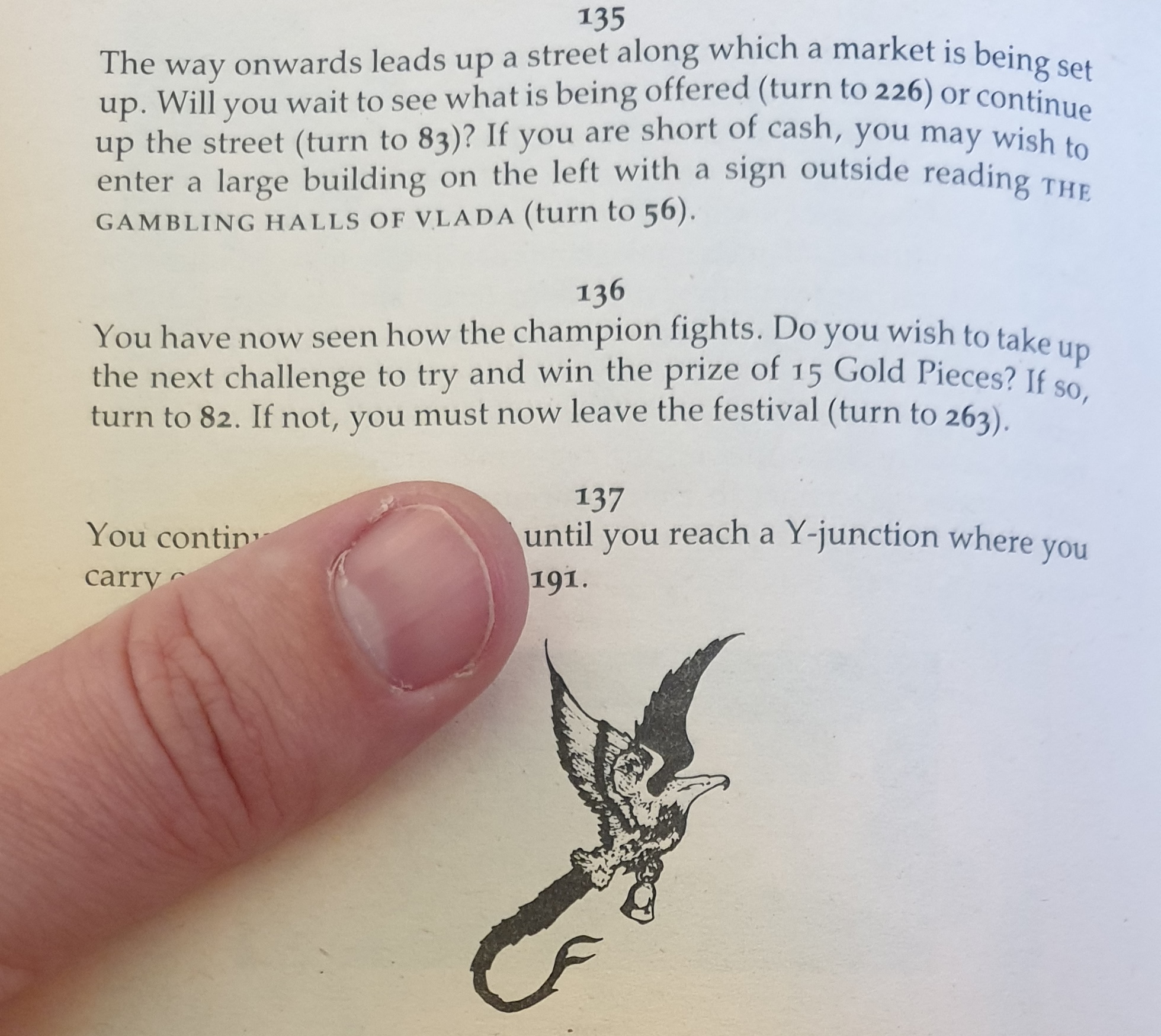 gamebooks that isn’t quite replicated when you’re playing on the Web. Maybe it’s the experience of keeping your finger in a page break to facilitate a “save point” for when you