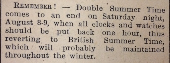 Ireland considered using the emergency powers they’d put in place to do the same, as a fuel saving measure… but ultimately didn’t. This was possibly because aligning her time with Britain might be seen as undermining her neutrality, but was more likely because the government saw that such a measure wouldn’t actually have much impact on fuel use (it certainly didn’t in Britain). Whatever the reason, though, Britain and Northern Ireland were again out-of-sync with one another until the war ended.