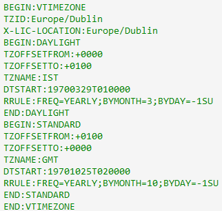 The author of an iCalendar file can choose to embed timezone information to explain what, in that file, a particular timezone means. That timezone information might say, for example, “When I say ‘Europe/Dublin’, I mean UTC+1, or UTC+0 in the winter.” Or it might say – like the code above! – “When I say ‘Europe/Dublin’, I mean UTC+0, or UTC+1 in the summer.” Both of these declarations would be technically-valid and could be made to work, although only the first one would be strictly correct in accordance with the law.