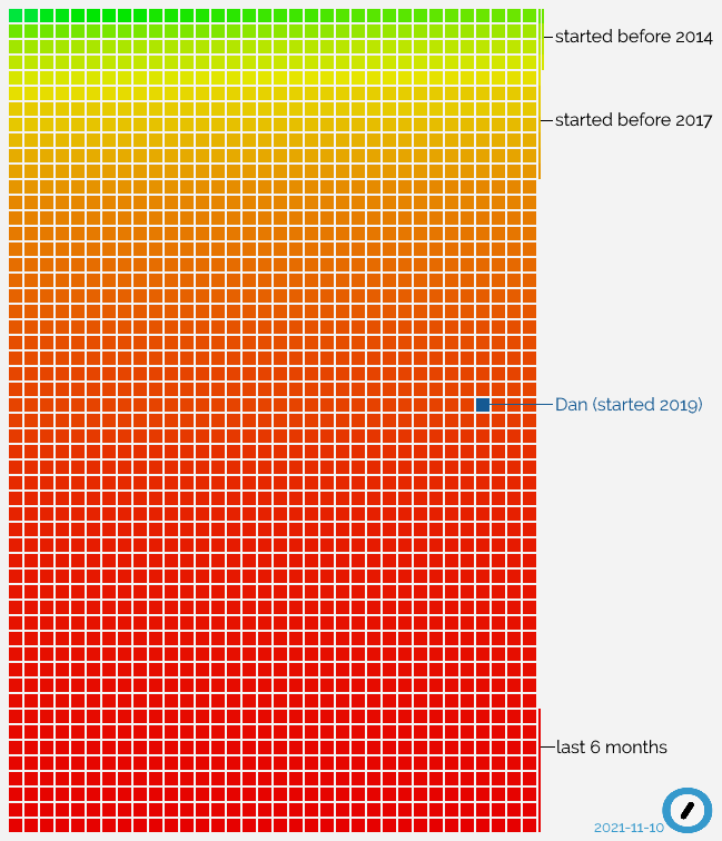 When you hear that from a 2-year employee at a tech company, it’s easy to assume that they have a high staff turnover, but Automattic’s churn rate is relatively low, especially for our sector: 86% of developers stay longer than 5 years. So what’s happening? Let’s visualise it: