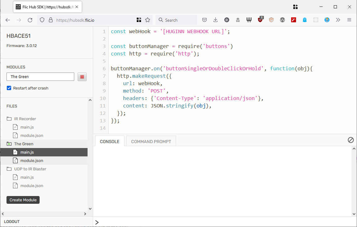 learning curve, but it’s incredibly powerful for automation tasks. The first step, then, was to set up my Flic Hub LR to talk to Huginn.