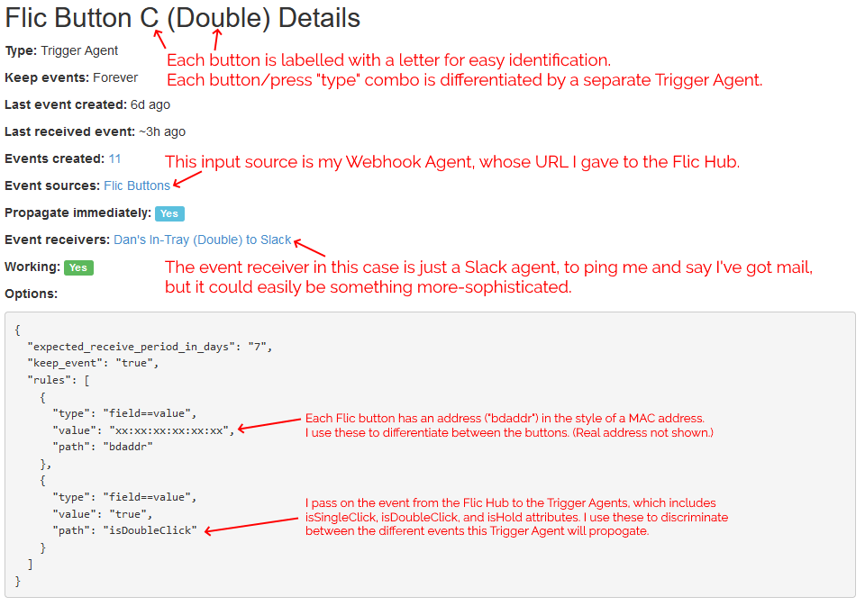 I configured Huginn with a Trigger Agent to receive events from my webhook and filter down to just single clicks on specific buttons. The events emitted by these triggers are used to
