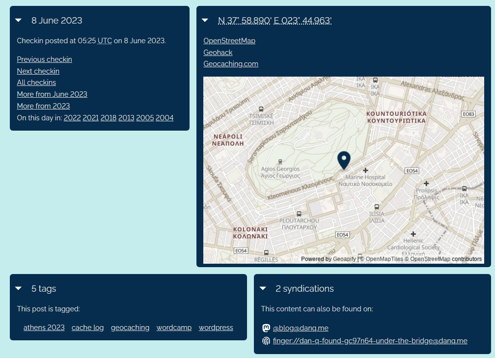 - Switched out the maps that appear on checkin posts so they’re precached images from OpenStreetMap rather than Google Maps.