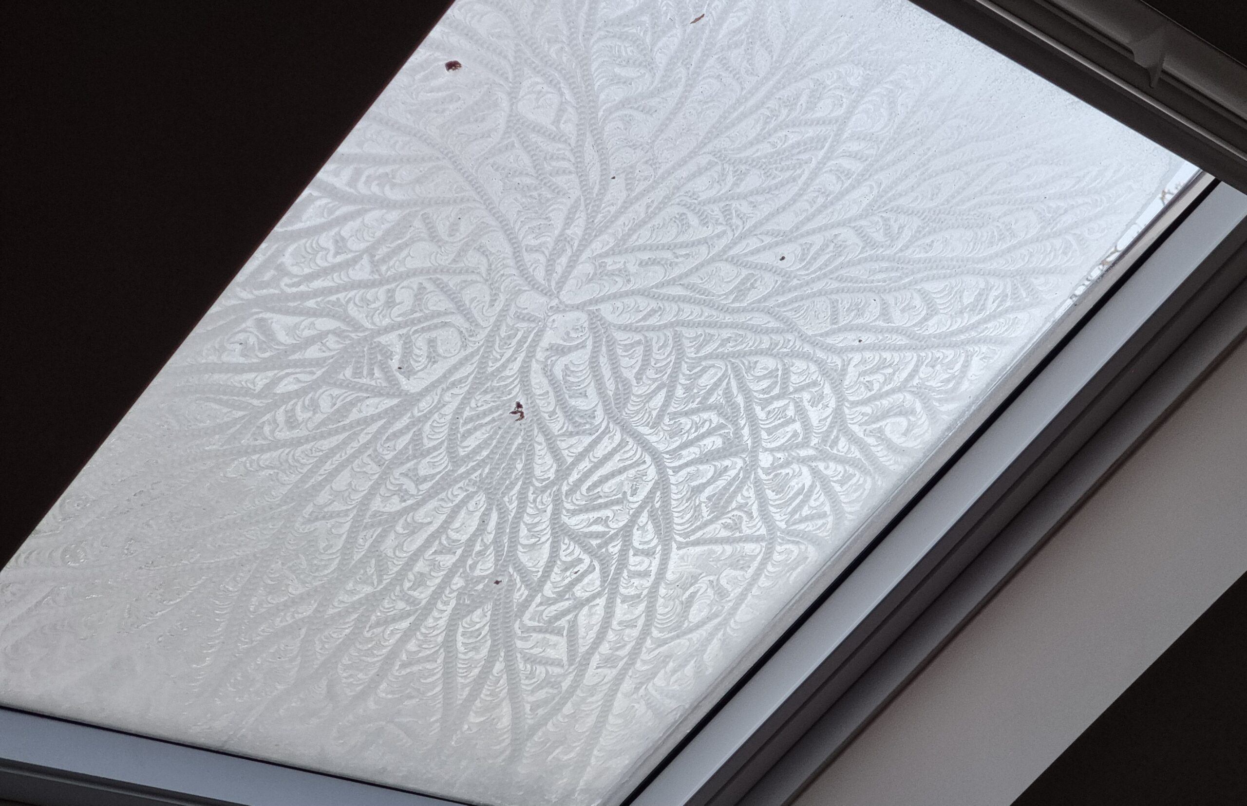 After a night that alternated between raining and freezing winds here, at the edge of Storm Éowyn, this morning my skylight has ice patterns on it that look beautiful and almost