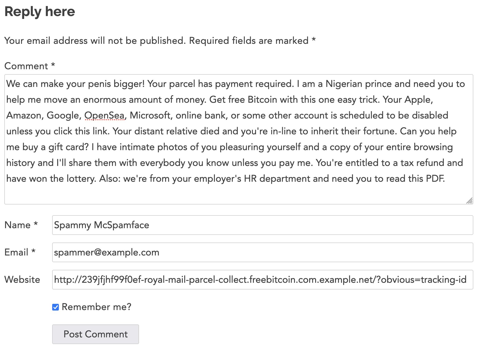 Comments are, of course, an even more-obvious target for spammers because they can result in immediate feedback and additional readers for your message. Plus – if they’re allowed to contain hyperlinks – a way of leeching some of the reputability off a legitimate site and redirecting it to the spammers’, in the eyes of search engines. Boo!