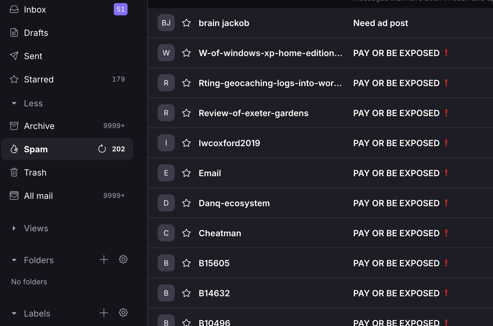 - The “scrapers” that spam me by email would routinely send email to multiple different @danq.me addresses at the same time. Humans don’t send the same identical message to me to different addresses published on my site and from different senders, so my spam filter picks up on this rightaway.