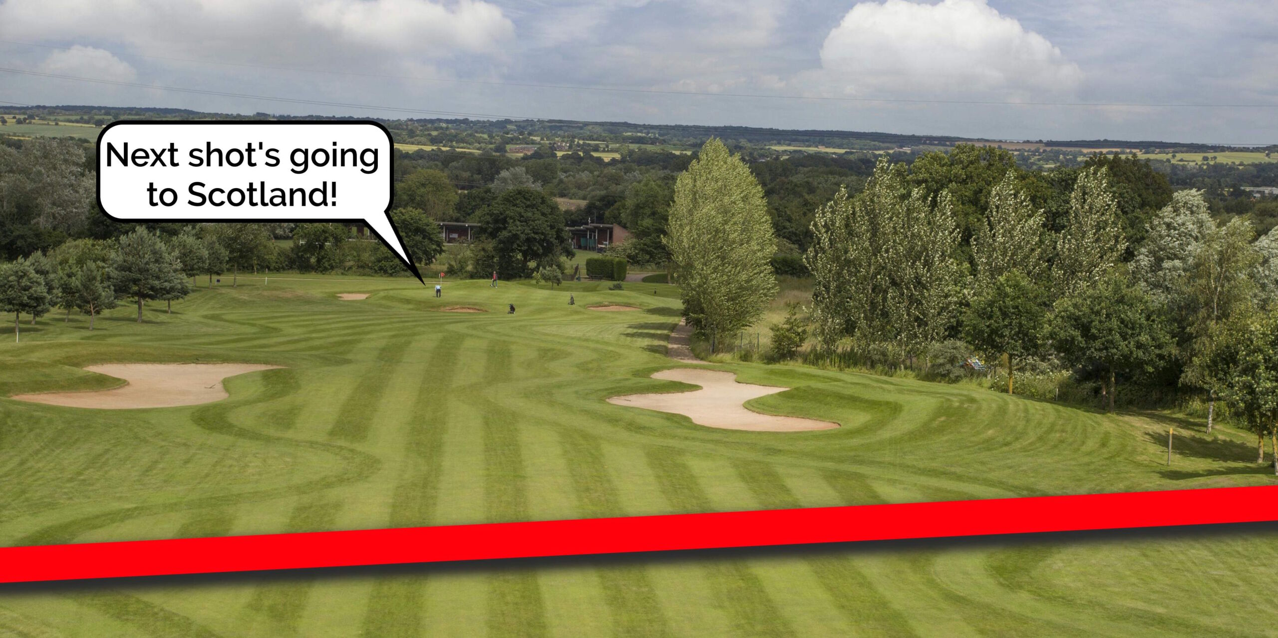 The line then pretty-much bisects Milton Keynes, leaving half its population closer to Scotland and half closer to Ireland, before doing the same to Daventry, before – near Sutton Coldfield – it drives right through the middle of the ninth hole of the golf course at the Lea Marston Hotel.