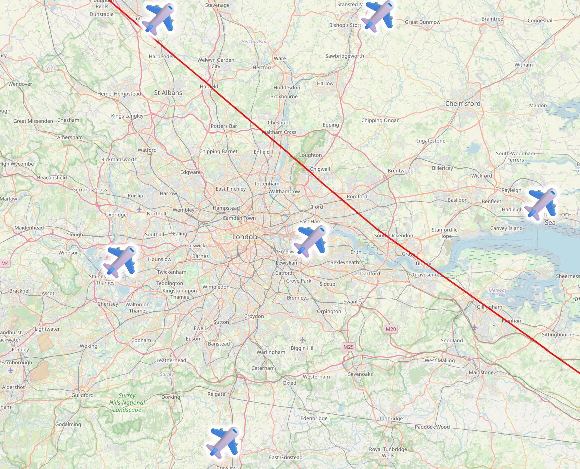 A little further North: London’s six international airports are split evenly across the line, with Luton, Stansted and Southend closer to Scotland… and City, Heathrow and Gatwick closer to Ireland.