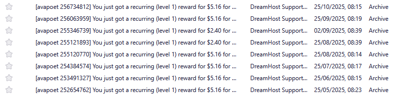 But it’s not to be: DreamHost emailed me last night to tell me that they’re killing their “Refer & Earn” program; replacing it with something different-but-incompatible (social media’s already having a grumble about this, I gather).