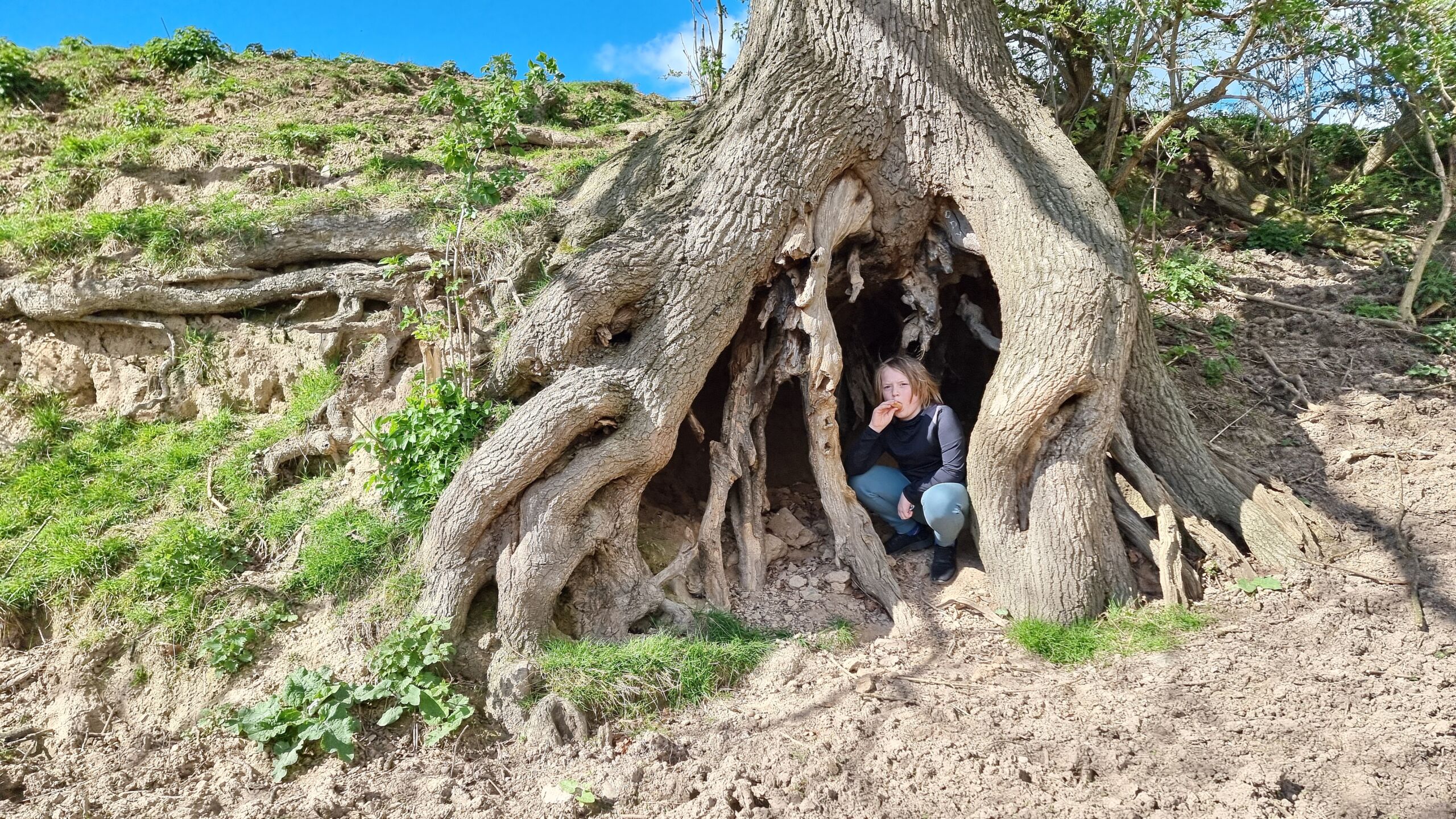 It took the geokid and I a moment or two to work out why this pylon was king, but once we had it was easy to find this (good-sized) cache. What a delightful Spring afternoon it was! And then the geokid found a tree under which the banks had eroded, making a perfect “hobbit hole” cave within its exposed roots (where he ate his ice cream).