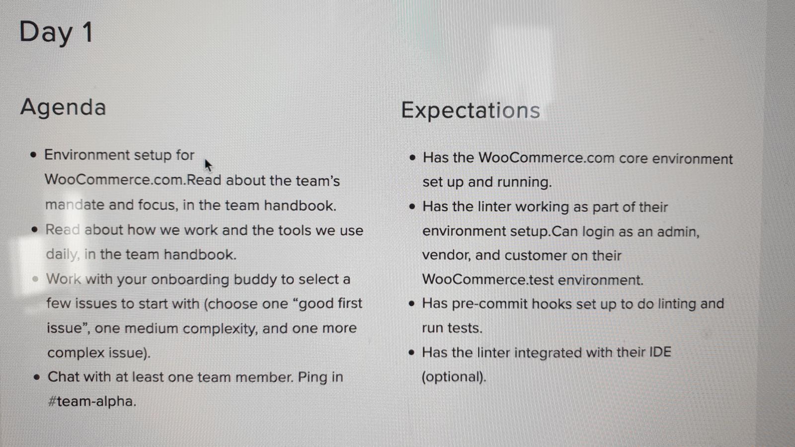 By comparison, my induction at Automattic was far more self-guided: each day in my first fortnight saw me tackling an agenda of things to work on and – in a pleasing touch I’ve seen nowhere else – a list of expectations resulting from that day. Defined expectations day-by-day are an especially good as a tool for gauging one’s progress and it’s a nice touch that I’ll be adapting should I ever have to write another induction plan for a somebody else.