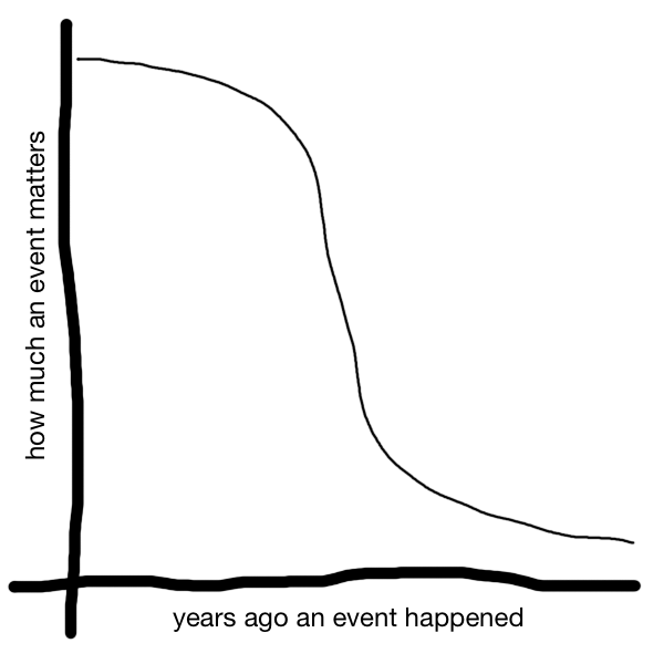Where the drop-off in relevance occurs is hard to pinpoint and it probably varies a lot by the type of event that’s being remembered: nobody seems to care about what damn terrible thing Trump did last month or the month before when there’s some new terrible thing he did just this morning, for example (I haven’t looked at the news yet this morning, but honestly whenever you read this post he’ll probably have done something awful).