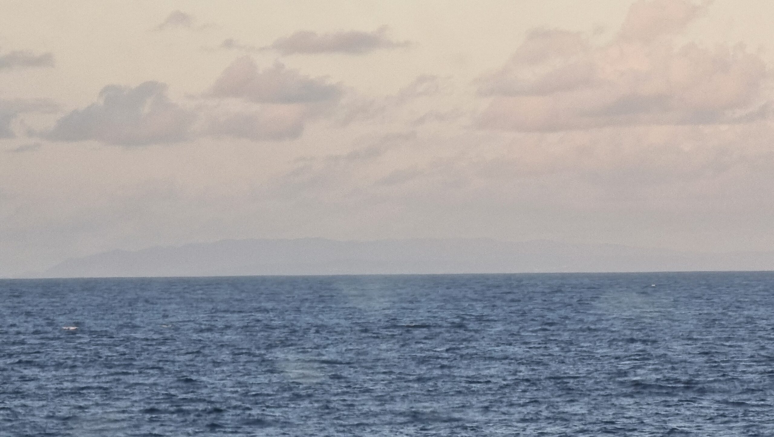 Across the sea, a rugged island begins to emerge over the horizon, through distant clouds.