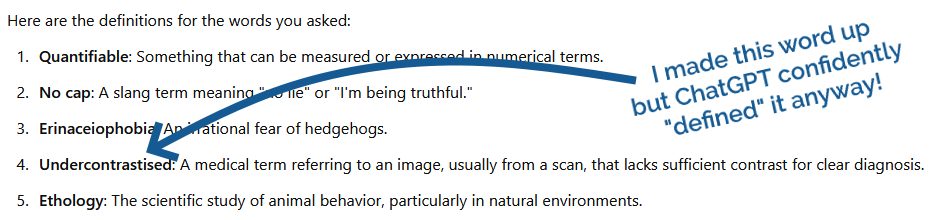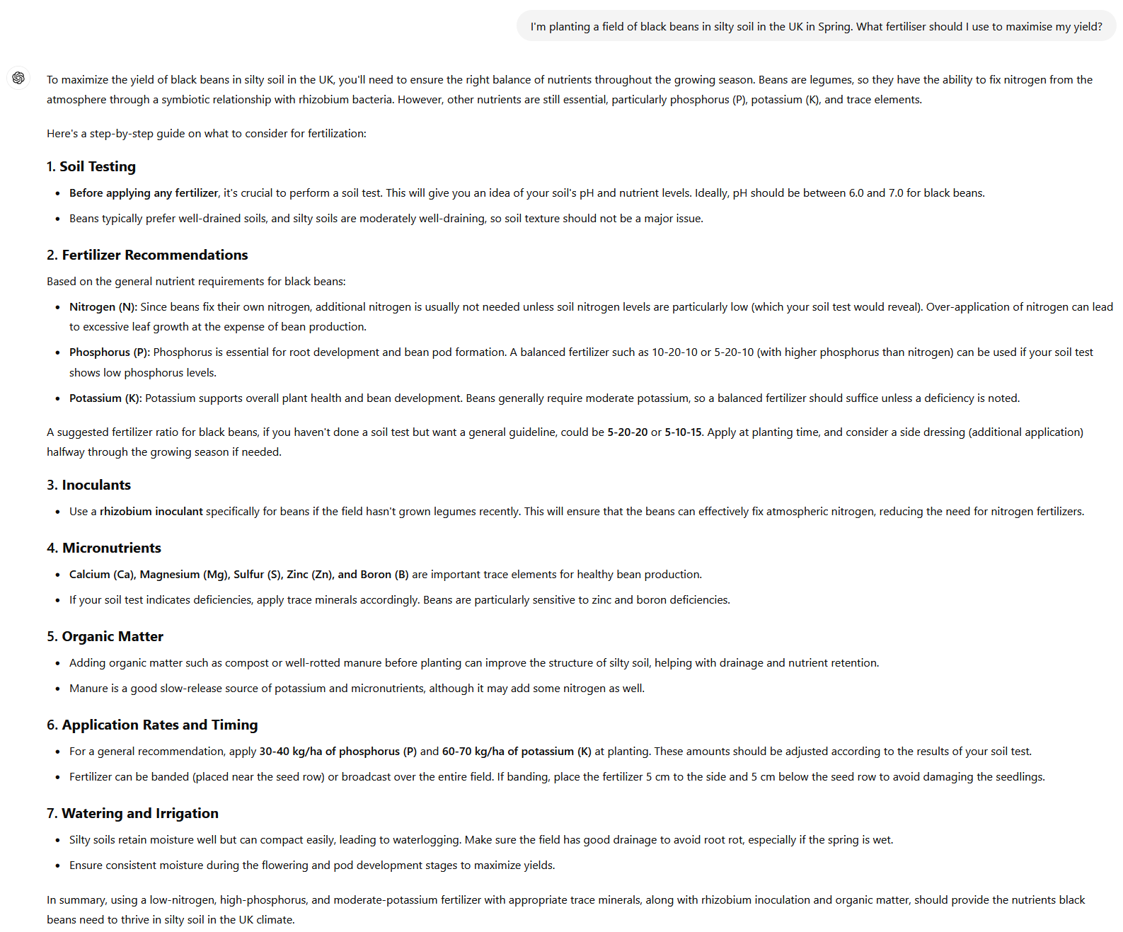 Bear in mind, of course, that there are plenty of topics in which the average person is less-knowledgable than the average of the content that was made available to the model. For example, I know next to noting about fertiliser application in large-scale agriculture. ChatGPT has doubtless ingested a lot of literature about it, and if I ask it what fertiliser I should use for a field of black beans in silty soil in the UK, it delivers me a confident-sounding answer: