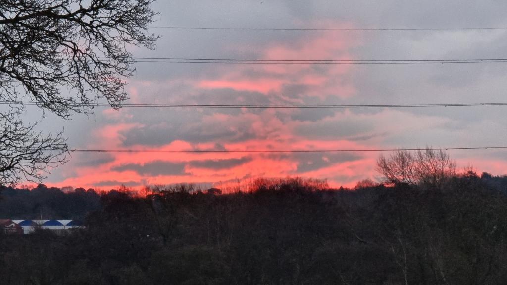 Sunrise taking off in earnest now with reds and pinks on the horizon, and my spine – unhappy for sleeping in an unfamiliar bed last night – is enjoying getting a stretch from the walk,
