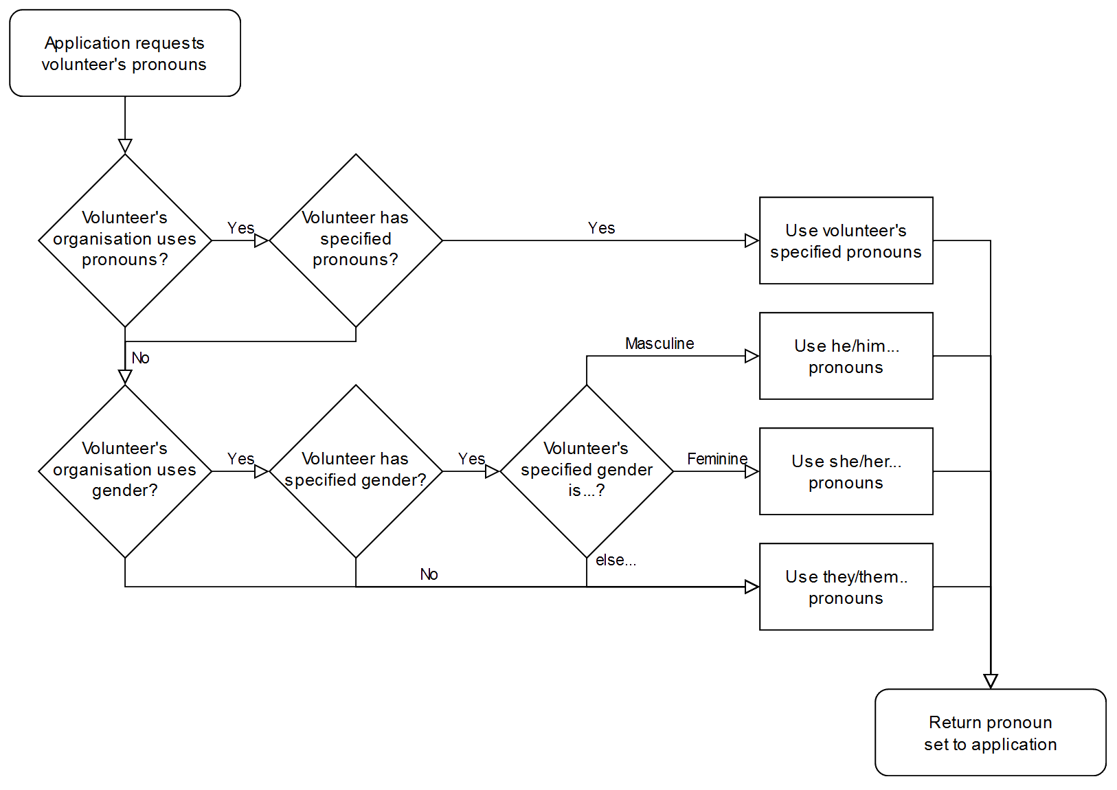 From 2018 we allowed organisations to add a “Pronouns” property, allowing volunteers to select from 13 different pronoun sets. If they did so, we’d use it; failing that we’d continue to assume based on gender if it was available, or else use the singular “they”.