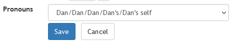 Ultimately, we’re probably going to need to differentiate between a more-rigid “what pronouns should Three Rings use when talking about you” and a more-flexible, perhaps optional “what pronouns should other humans use for you”? Alternatively, maybe we could allow people to select multiple pronoun sets to display but Three Rings would only use one of them (at least, one of them at a time!): “which of the following sets of pronouns do you use: select as many as apply”?