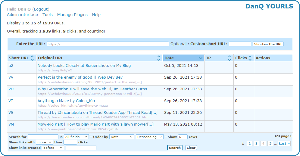 YOURLs isn’t the prettiest tool in the world, but then it doesn’t have to be: only I ever see the interface pictured above!