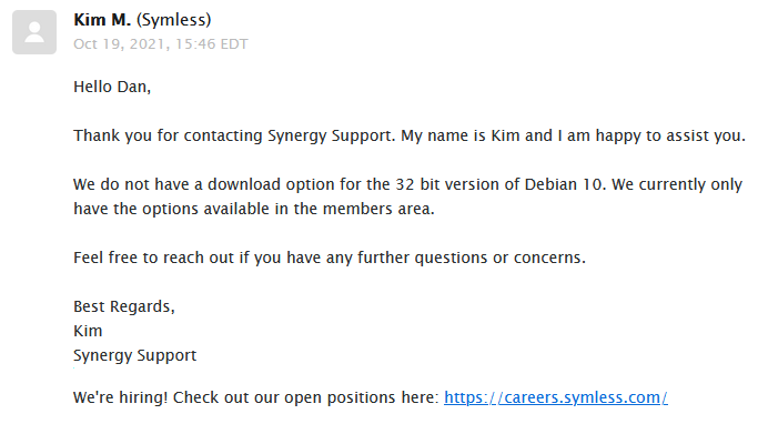 a 64-bit version of the Debian 10 binary. I’ll note that this isn’t a fundamental limitation – there are 32-bit versions of Synergy available for Windows and for ARMhf