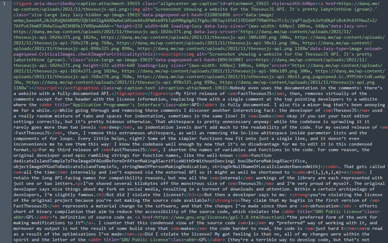 My first release of FastTheseusJS, then, removes virtually of the comments, replacing them with a single comment at the top pointing developers to a website where the