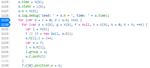 Pop up your browser’s developer tools (F12, usually) and switch to the Debugger tab. Open the file game/js/release.js and uncompress it by pressing the