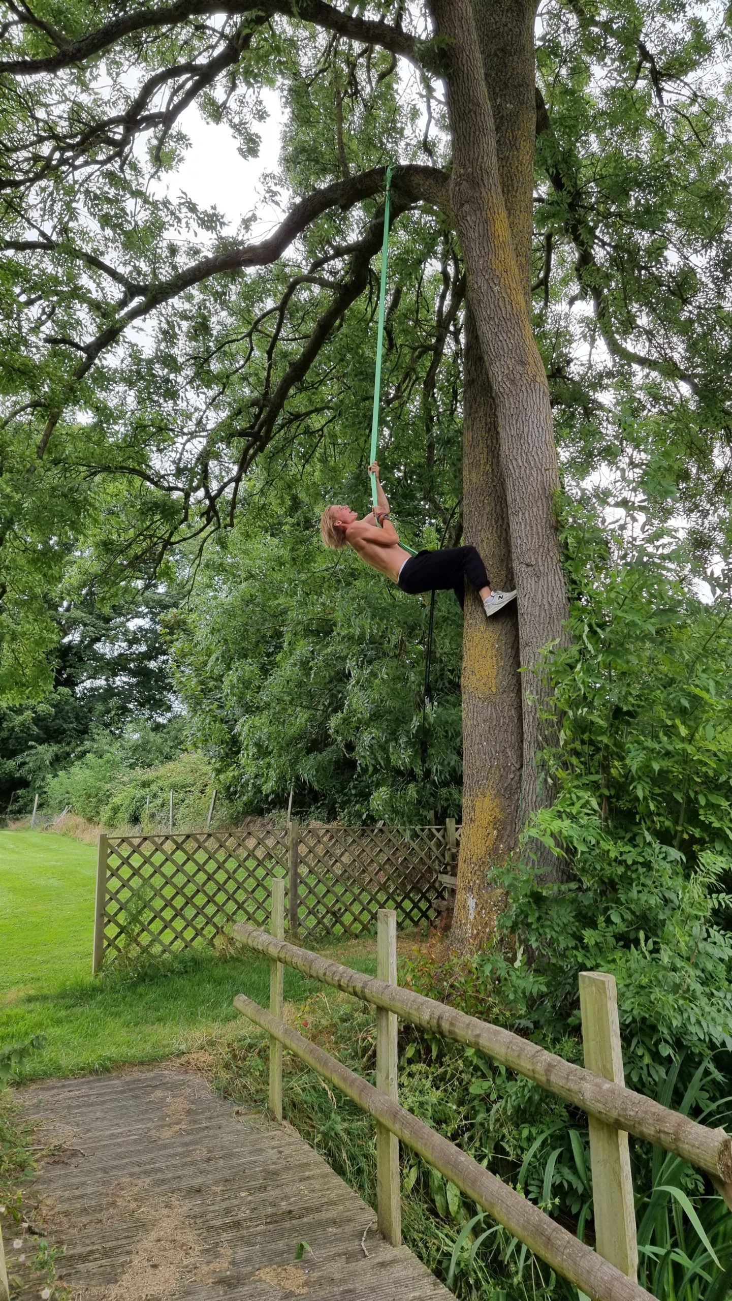 Robin (and Owen – now recovered but not featured in this picture) – were instrumental in helping us run some ropes over a high bough of one of our garden’s trees…