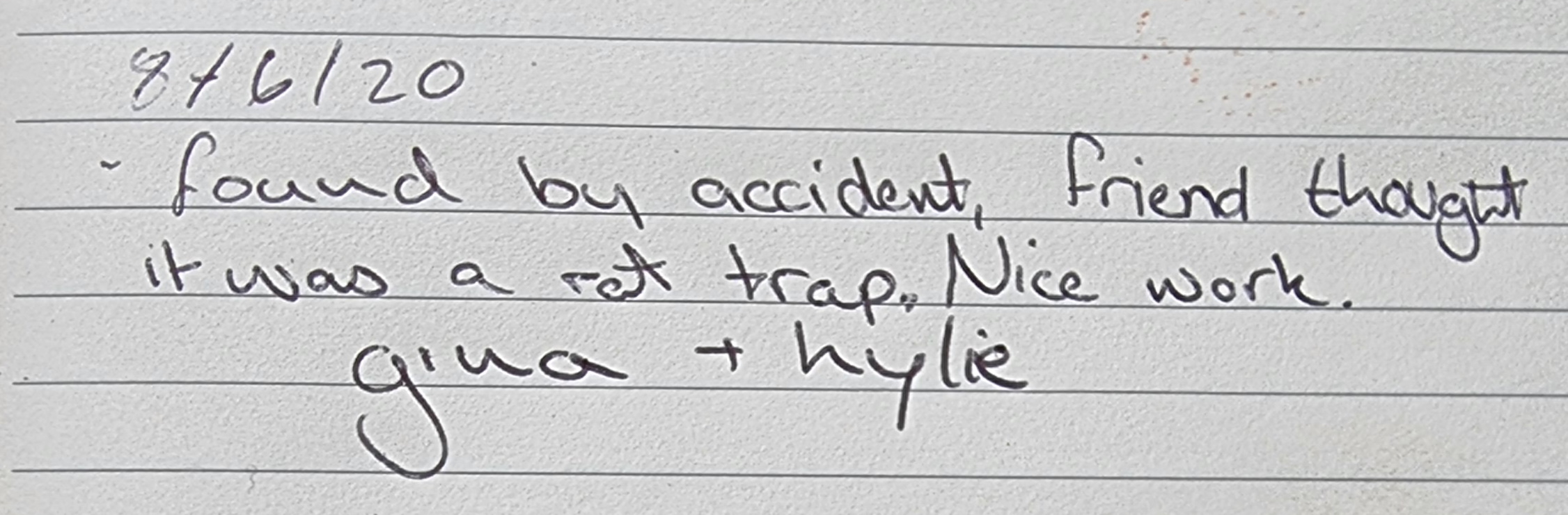 Dropped by while out for a walk and discovered that “Gina + Kylie”, a pair of presumably non-geocachers, found the cache on Tue 8 June and left a note in the logbook! This is cool, not