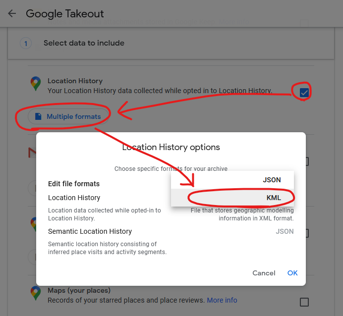 I found a setting in Google Takeout to export past location data in KML, rather than JSON, format. KML is understood by GPSBabel which can convert it into GPX. I can “cut up” the resulting GPX file using a little grep-fu (relevant xkcd?) to get month-long files and import them into μLogger. Easy!