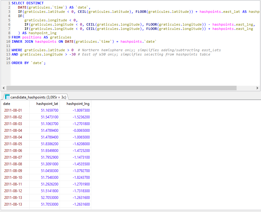 Next, I got a set of hashpoint offsets. I only had personal positional data going back to around 2010, so I didn’t need to accommodate for the pre-2008 absence of the 30W time zone rule. I’ve had only one trip to the Southern hemisphere in that period, and I checked that manually. A little rounding and grouping in SQL gave me each graticule I’d been in on every date. Unsurprisingly, I spend most of my time in the 51 -1 graticule. Adding (or subtracting, for the Western hemisphere) the offset provided the coordinates for each graticule that I visited for the date that I was in that graticule. Nice.